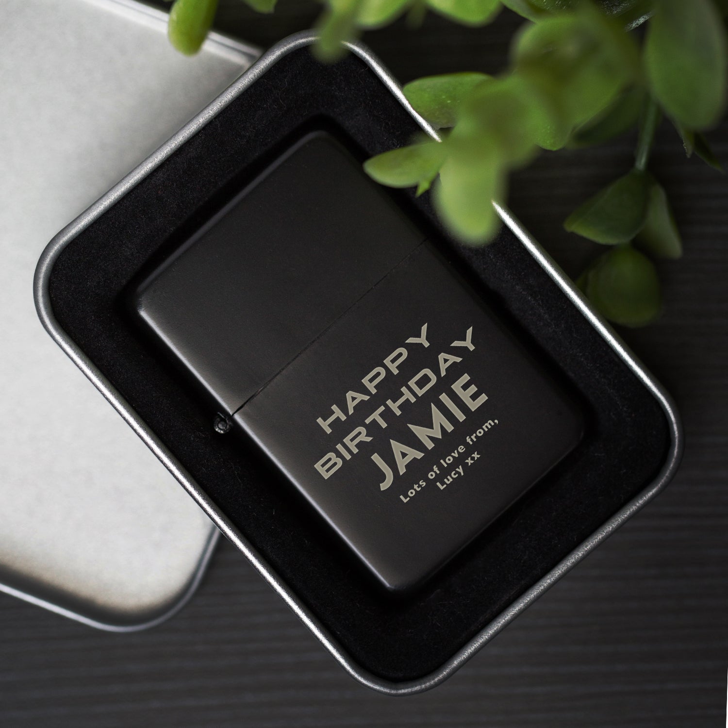 Celebrate birthdays in style with this matt black lighter, featuring “Happy Birthday” as a fixed design and personalised with any name and two custom lines of text. A thoughtful, practical gift supplied in a premium metal tin gift box. Please note: Lighters are not supplied with fuel for safety reasons and must be filled before use.
