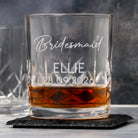 Say thank you with a personalised crystal panel tumbler, engraved with a wedding role, name and date. This design is shown as Bridesmaid, but the top line can be changed to any role or wording you like — perfect for maid of honour, bride, mother of the bride and more.