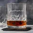 Celebrate the big day with a personalised crystal panel tumbler, engraved with a wedding role, name and date. This design is shown as Groomsman, but the top line can be changed to any role or wording you like — perfect for best man, usher, groom, father of the groom and more.