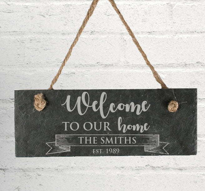 Personalised Welcome to Our Home Slate Sign | Engraved Surname & Date