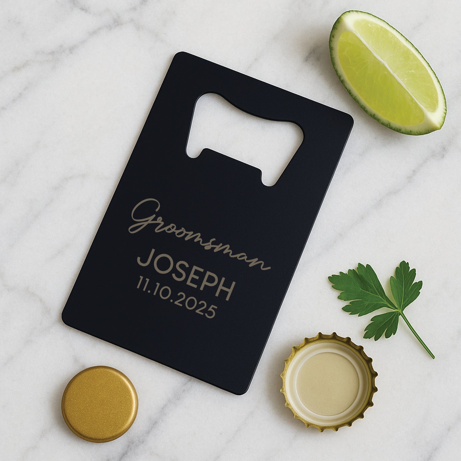 Thank your groomsman with a personalised, practical keepsake. This matt black credit card bottle opener is engraved with any name (up to 12 characters) and a special date (up to 20 characters). The slim, wallet-sized design means it’s always handy—perfect for wedding parties, stag dos, and thank you gifts.