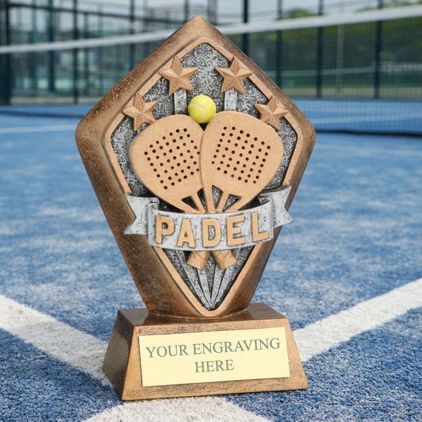 Celebrate a match win, tournament victory, or end-of-season awards with our Personalised Padel Trophy. Featuring a standout bronze and gold diamond holder design with a padel disc detail, it’s a great choice for clubs, leagues, coaches, or anyone wanting a proper keepsake for a brilliant performance.