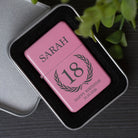 This matt pink lighter features a classic birthday crest design and is personalised with any name, age, and two lines of custom text below (e.g. “Happy Birthday”, “10.10.2026”). A unique keepsake for milestone birthdays, supplied in a premium metal tin gift box. Please note: Lighters are not supplied with fuel for safety reasons and must be filled before use.