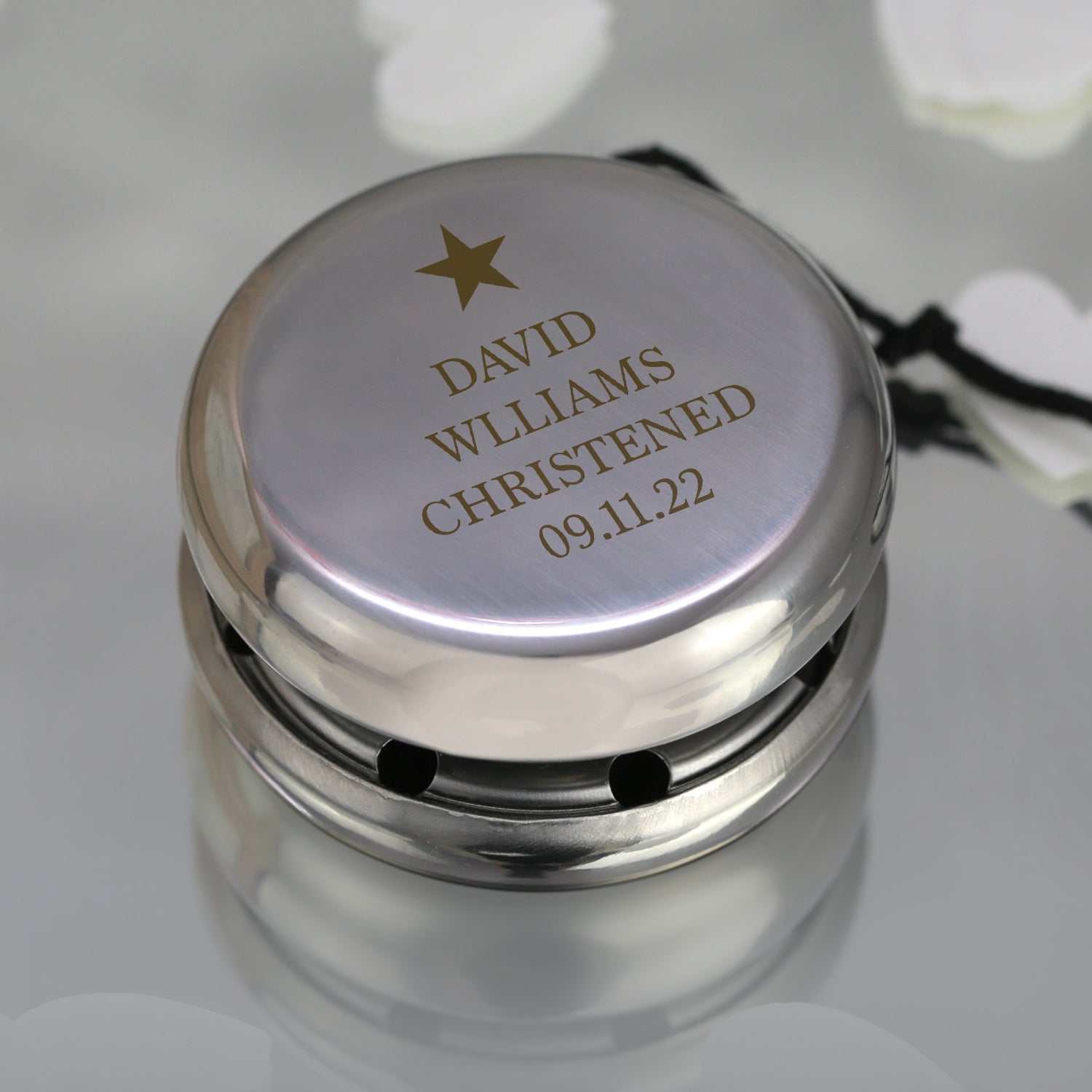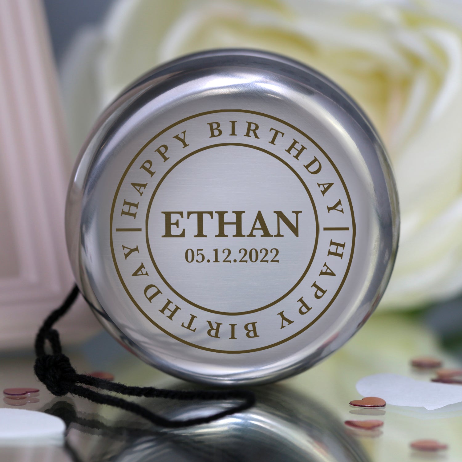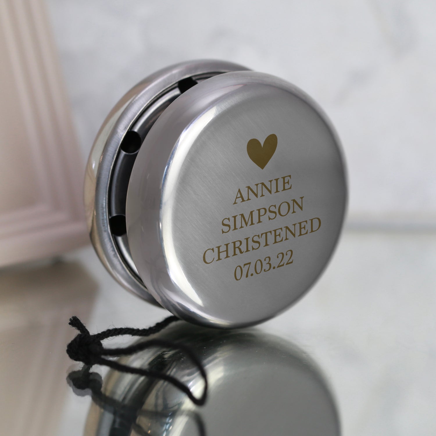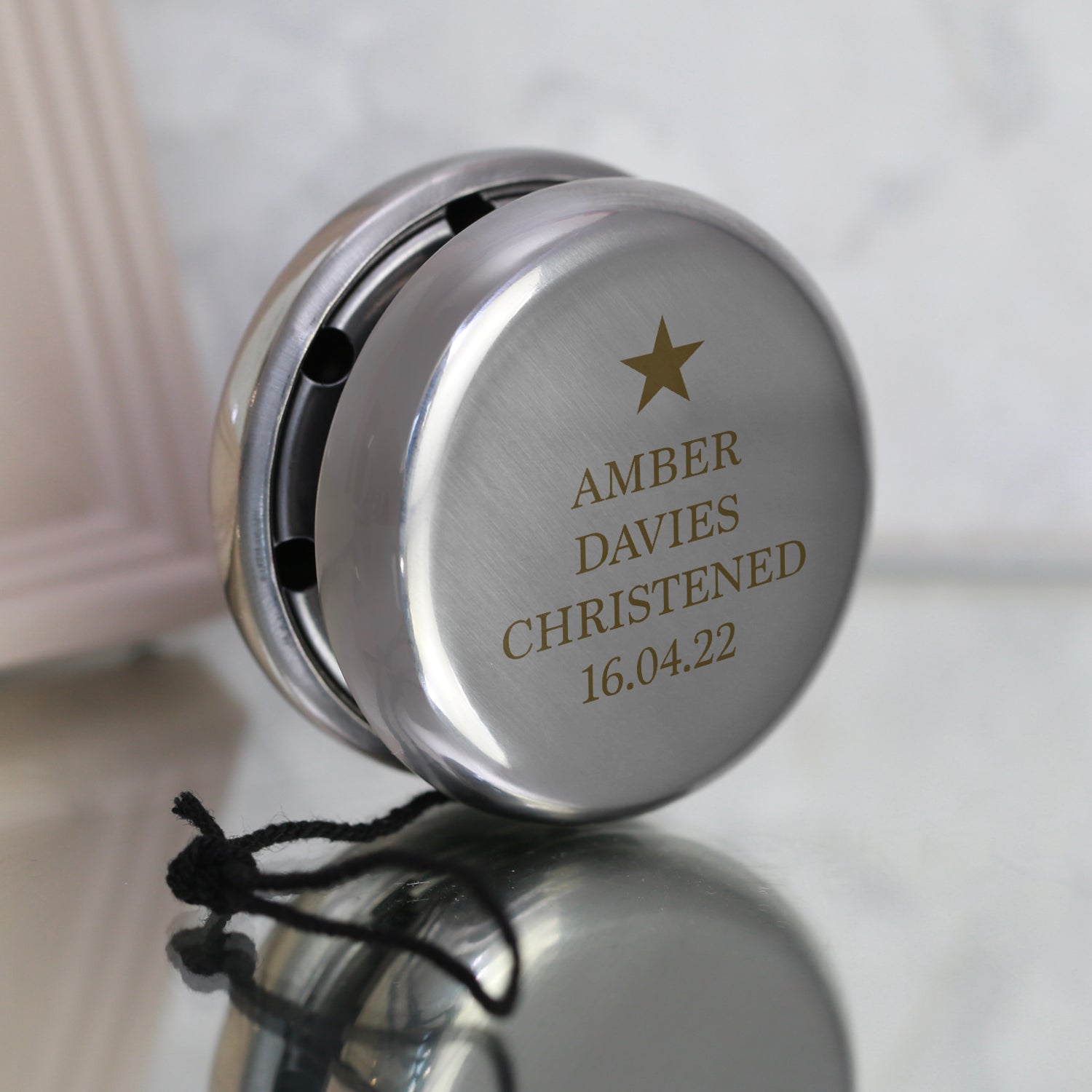 Discover our timeless collection of personalised stainless steel yoyos, expertly crafted for special occasions. Each classic yoyo measures 5cm x 5cm x 3cm and is custom engraved to create a unique keepsake that will be treasured for years. Perfect for christenings, page boys, birthdays, and memorable milestones.