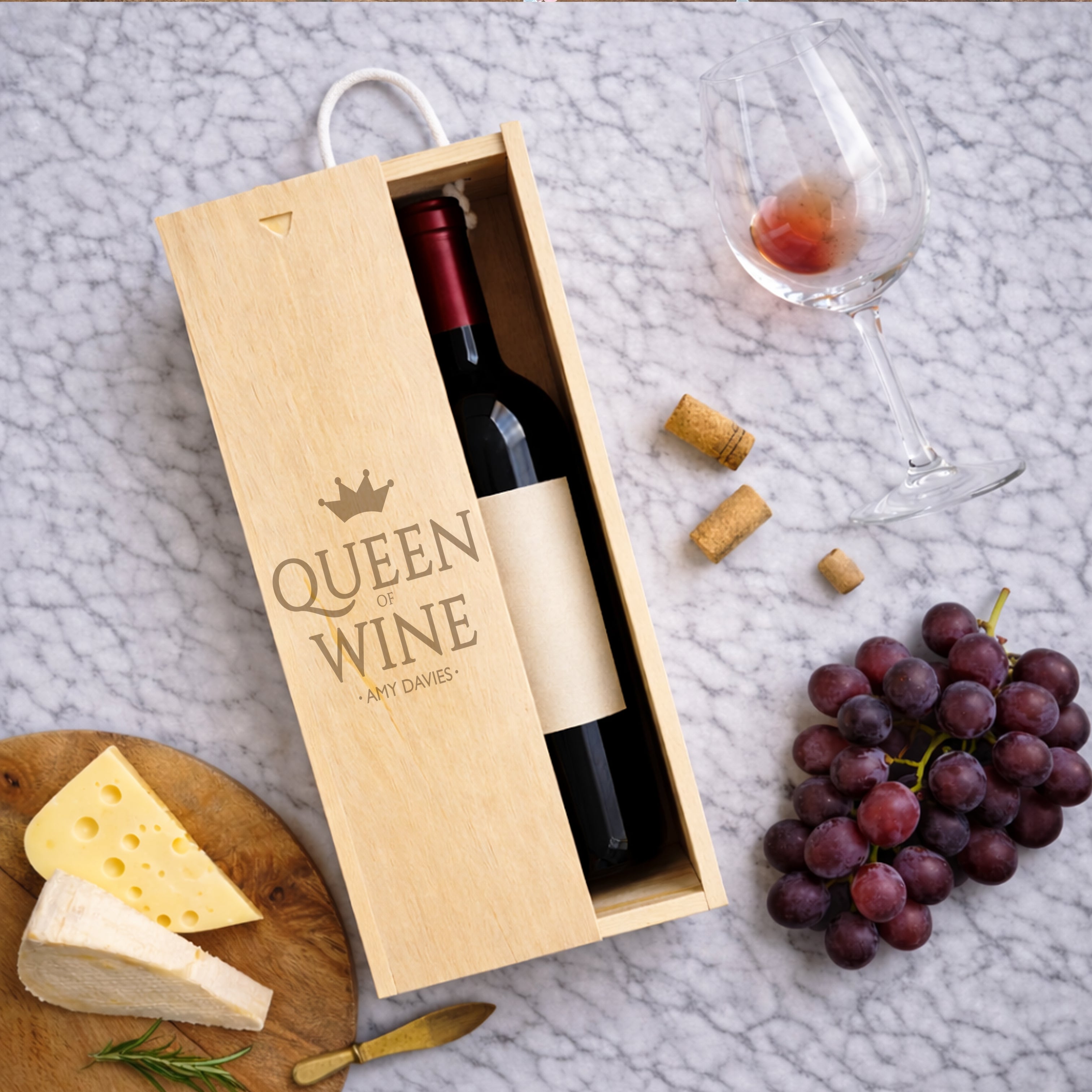 Discover our range of personalised wooden wine boxes—perfect for gifting wine at weddings, anniversaries, birthdays, retirements, and corporate events. Each box is expertly laser engraved in Manchester with your custom name, message, or special date. Fast UK dispatch and free delivery on orders over £40. Choose from single or double bottle boxes, complete with optional accessories for a truly memorable gift presentation.