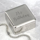 Mark a milestone in style with this elegant silver trinket box, laser engraved with “21st Birthday” (or your own two-line message). A timeless keepsake for jewellery, charms, or special treasures—perfect for making a 21st birthday extra memorable.