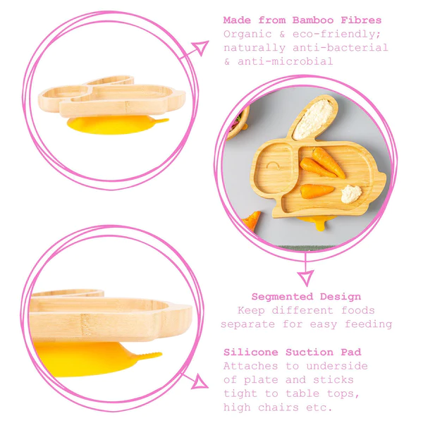 Each dish has been expertly crafted from natural 100% bamboo and is melamine free. This provides incredible strength and resilience while also enjoying all the inherent anti-bacterial and anti-microbial qualities of the bamboo plant. Perfectly designed for meals at all times of day, the segmented Rabbit design of this plate allows you to keep foods separated for easy feeding, while the heat-resistant properties of bamboo keep tiny fingers protected should they reach out and touch the sides.