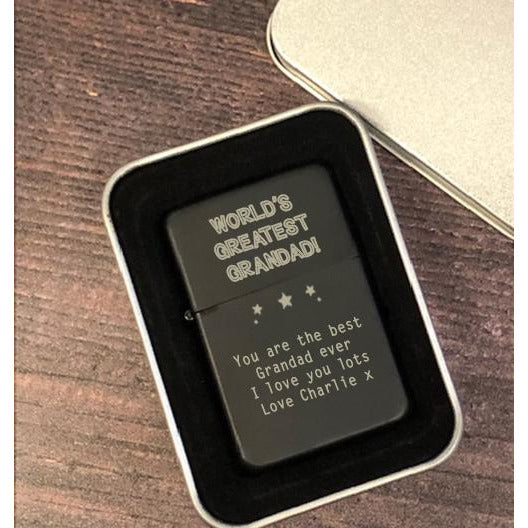 Celebrate Grandad with our personalised “World’s Greatest Grandad” black lighter, expertly engraved in Manchester, UK. Customise this premium matte black lighter with your chosen name or short message for a truly personal touch. Presented in a gift box, it’s the perfect present for Father’s Day, birthdays, Christmas, or just to show Grandad he’s the best. A practical keepsake he’ll treasure and use every day.