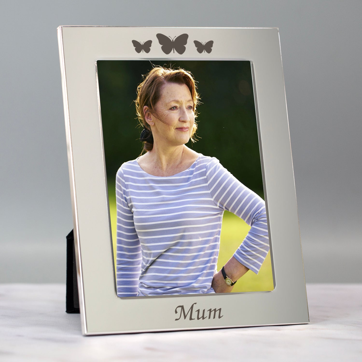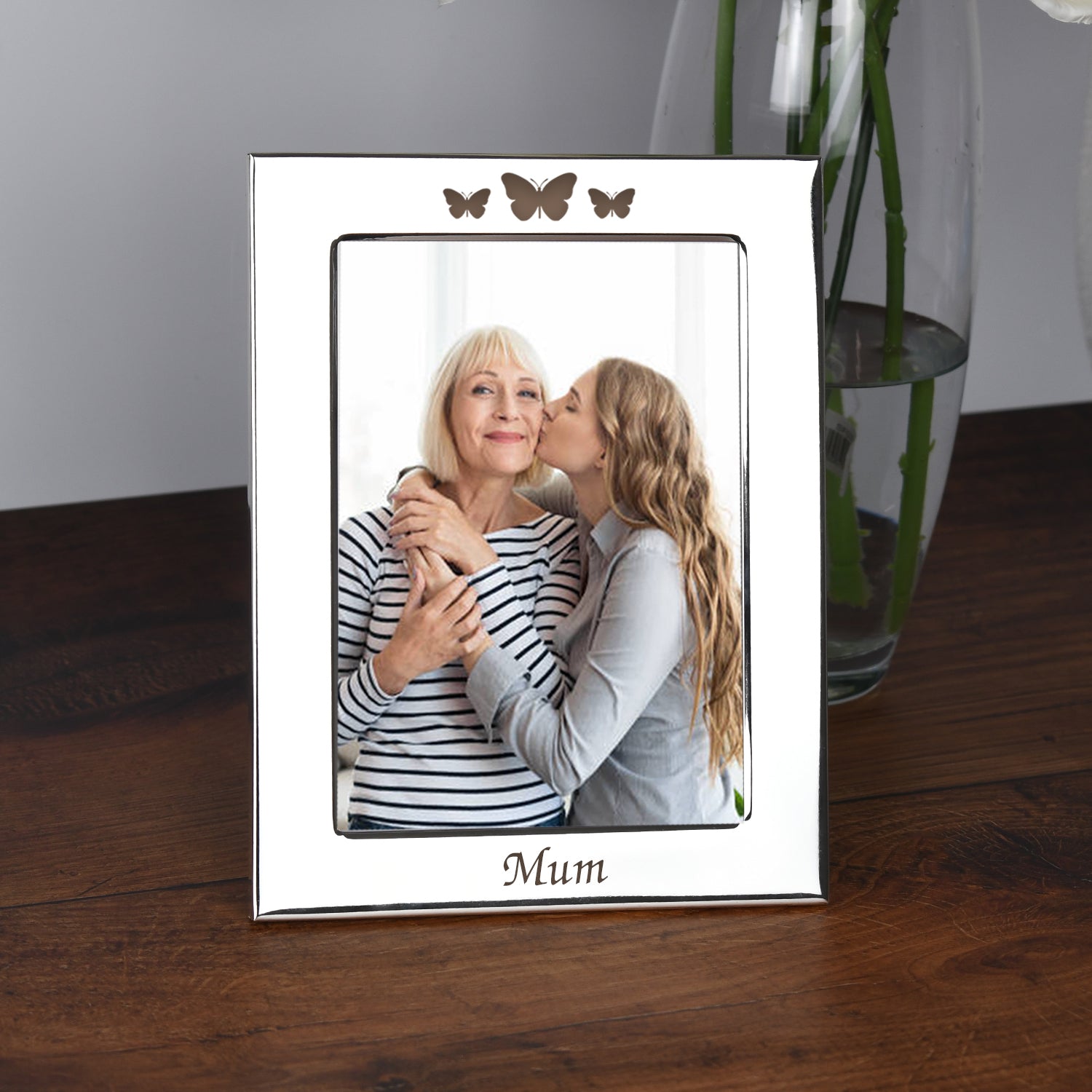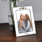 Celebrate a special mum with our Personalised Silver 5x7 Mum Photo Frame, featuring three beautifully engraved butterflies at the top of the frame. The bottom of the frame, beneath the photo, can be personalised with “Mum” or any wording of your choice (up to 20 characters). This elegant silver-plated frame is the perfect keepsake for Mother’s Day, birthdays, Christmas, or simply to show your love. Display a cherished 5x7 photo and create a heartfelt gift she’ll treasure.
